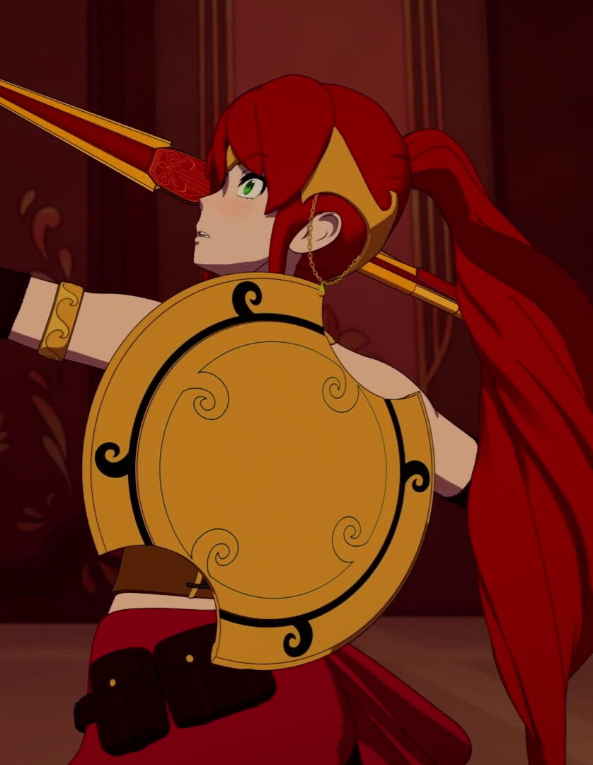 Pyrrha was born into an average civilian family in the city of Argus. She was exposed at an early age to the idea of being a Huntress, and enrolled at Sanctum Academy near her family home. It became clear she had a talent for combat after crafting her own weapon and being the first in her class to discover her Semblance; this led her to enter the Mistral Regional Tournament in her first year. She was the youngest competitor and set a record for each of her wins in talent and speed, taking the title four years in a row until her graduation from Sanctum Academy, with high honours and offers to attend the four major Huntsman Academies. Despite what most expected--which was Pyrrha to attend Mistral Academy to continue competing in the Regionals and eventually take the Vytal Festival title in the Academy's name--she chose to move away from home and attend Beacon Academy in the hopes she could go under the radar and get away from some of her fame.