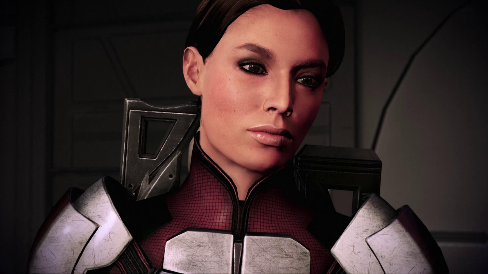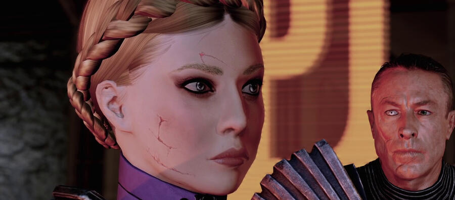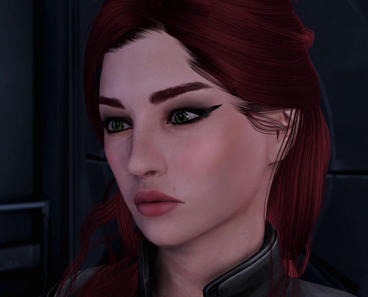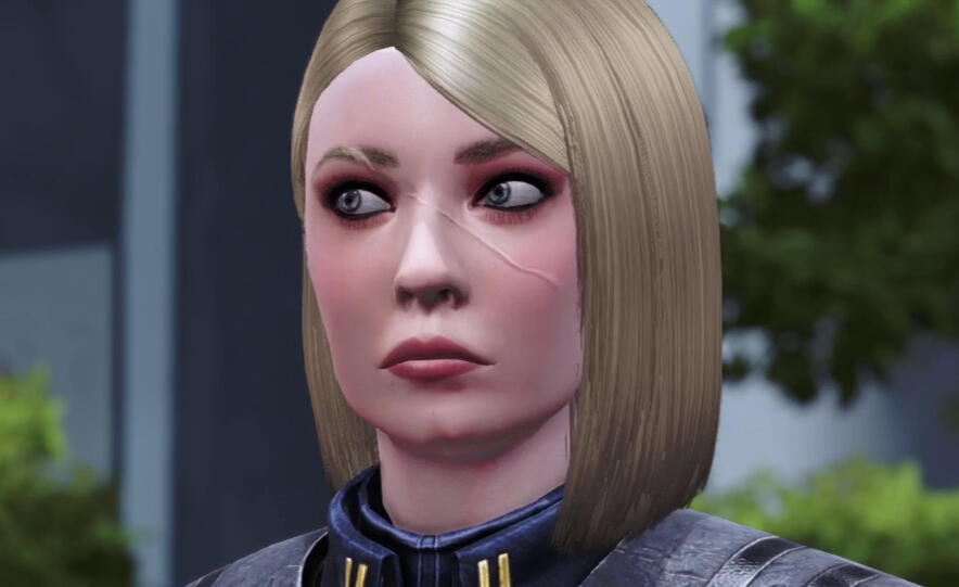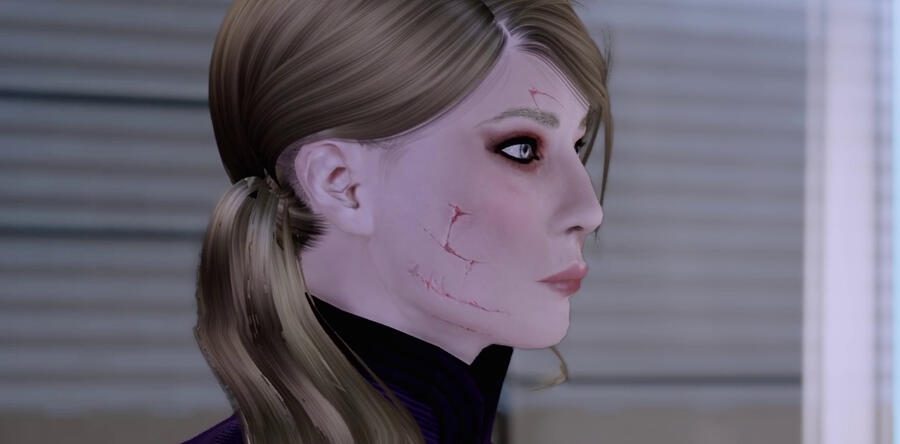 scars. pre-resurrection, skin graft scars down her shoulders, back, arms, legs, and torso, one long scar from right eyebrow to left cheek. post-resurrection, glowing scars on cheeks, forehead and jaw from cybernetics. post-ME2, no notable scarring; post-Reaper War, burn scars on both arms.