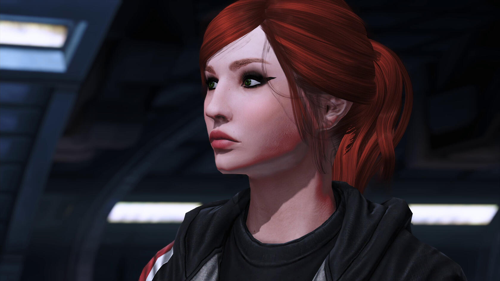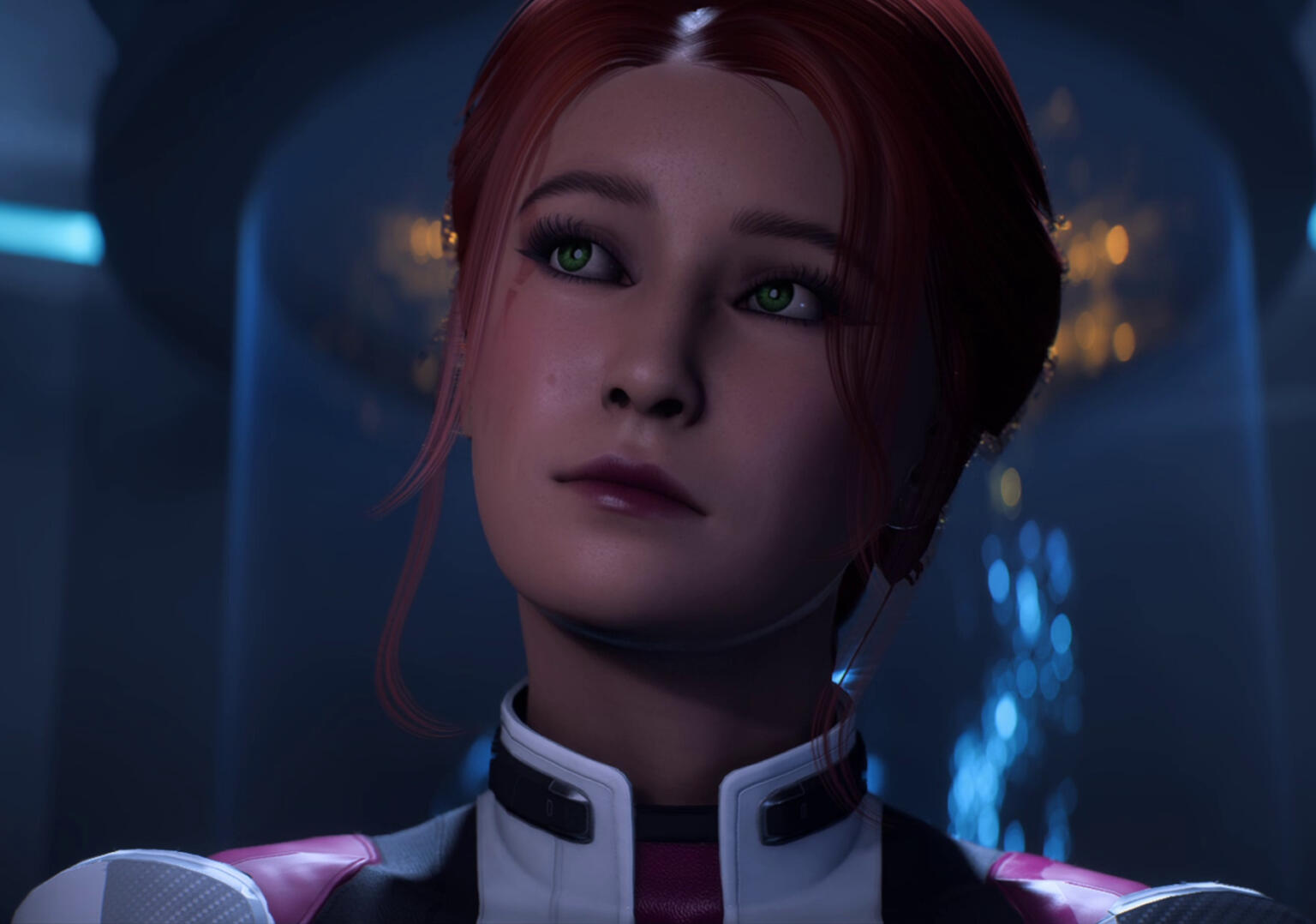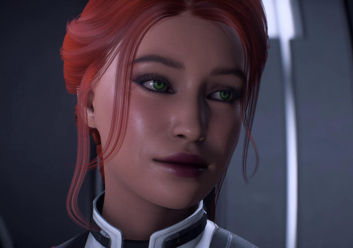 scars. pre-resurrection, skin graft scars down her shoulders, back, arms, legs, and torso, one long scar from right eyebrow to left cheek. post-resurrection, glowing scars on cheeks, forehead and jaw from cybernetics. post-ME2, no notable scarring; post-Reaper War, burn scars on both arms.