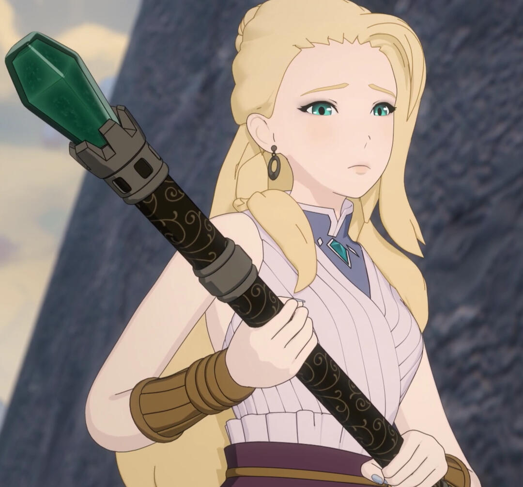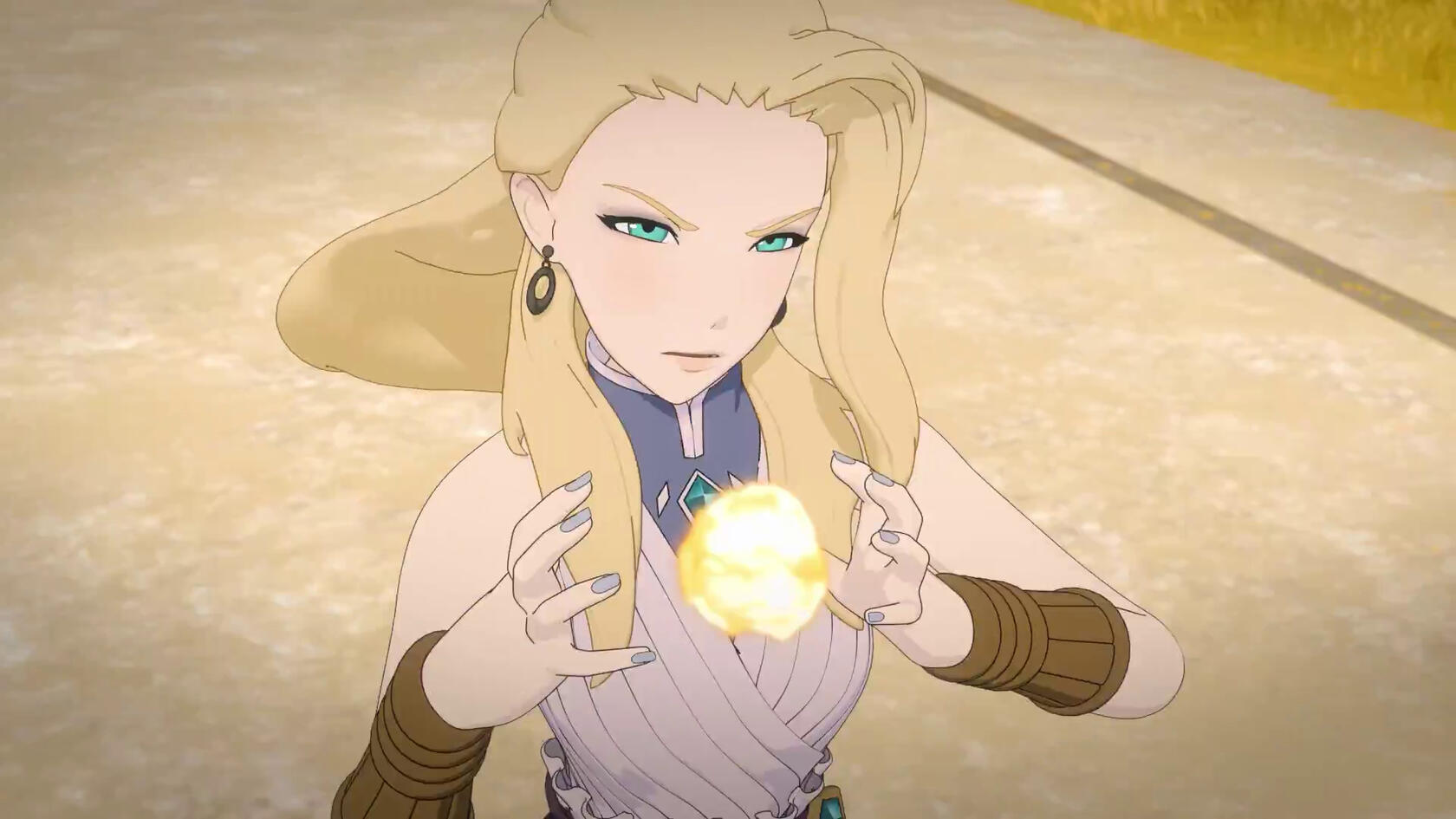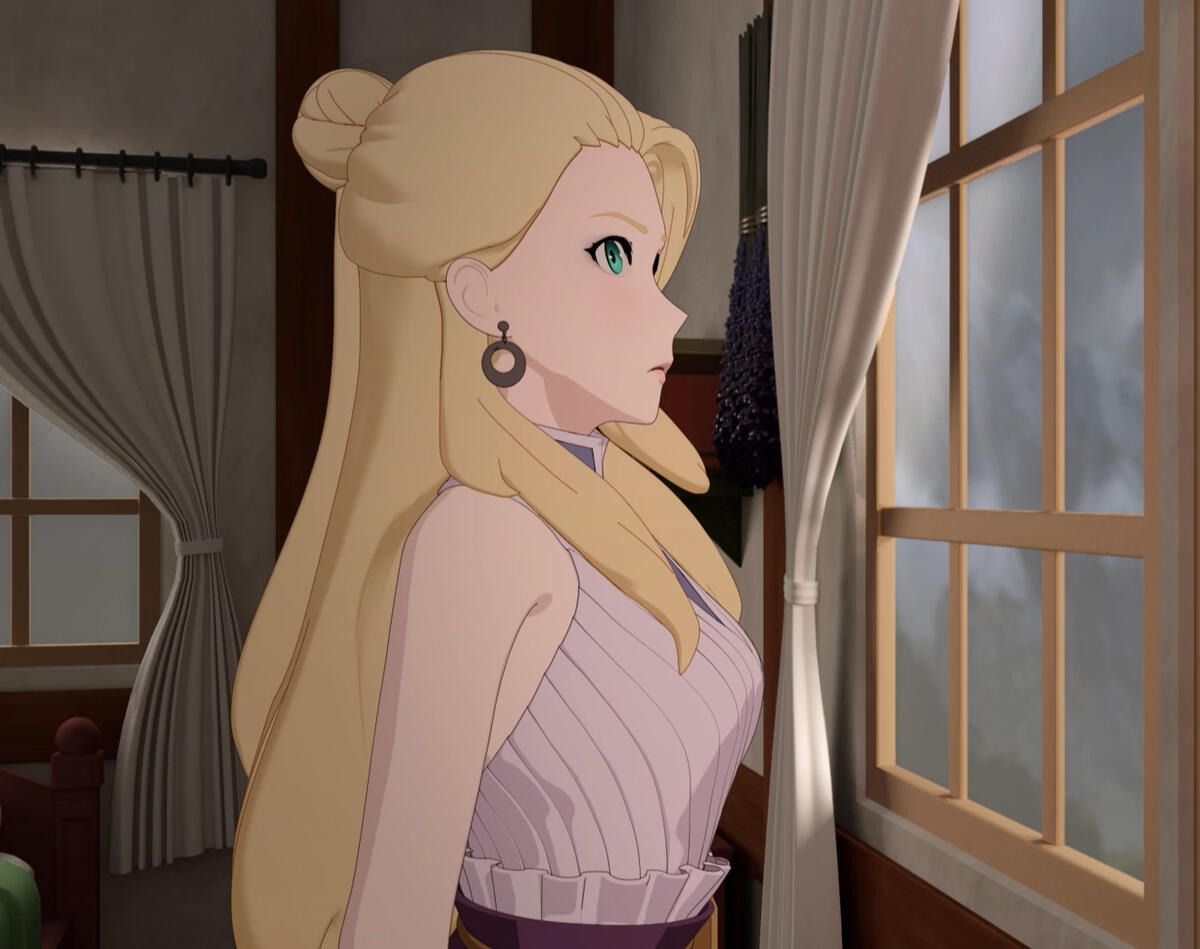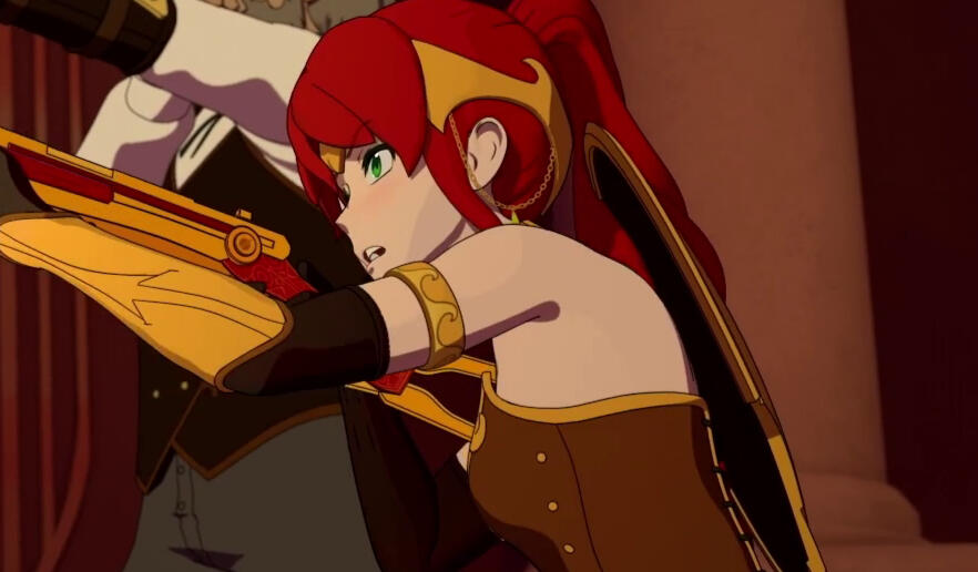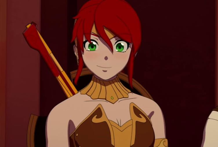 A secondary version to the above, but rather than being rushed to Argus, Jaune reaches the tower in time with Ruby and finds Pyrrha in critical condition. It is Jaune's Semblance that saves her life in the process after Cinder is injured by Ruby. She remains in Vale until RNJR leaves, offering to journey to Mistral with them for answers. She takes on a modified outfit of her original, consisting of the same platelegs she wore previously, a fully-armoured breastplate with one pauldron, and her bracer from her previous outfit. She wears her hair down in a long braid down her back (as opposed to her previous ponytail). She further takes on her new appearance in Atlas.